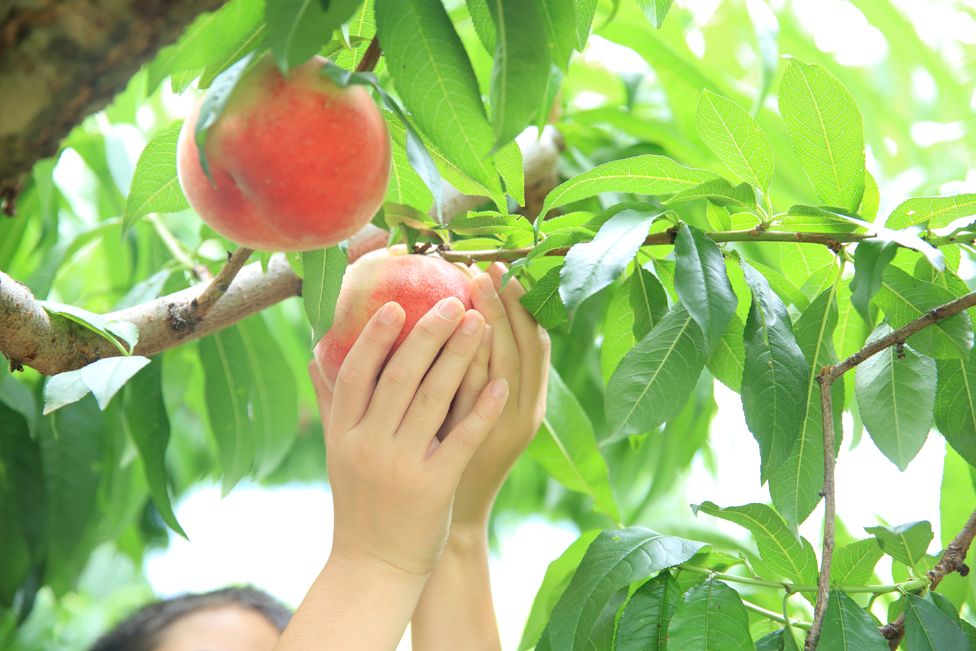7月上旬から8月下旬にかけて繊維が少なく果汁が多い甘さが自慢の白鳳系、香りの良い甘く上品な白桃系の桃が収穫できます。